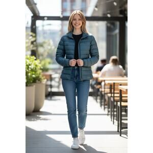 This teal blue jacket features a solid pattern, Quilted, down Filled. This jacket offers both style and practicality with its down filled lining for warmth, soft polyester outer shell, and quilted accents.
