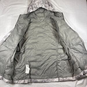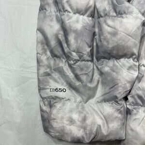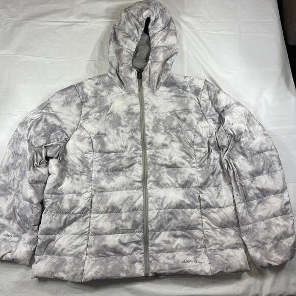 This Eddie Bauer EB650 down puffer jacket is a women’s 2XL and features a modern gray cloud-inspired pattern that offers a clean and versatile outdoor look. Built for dependable cold-weather comfort, this jacket uses an 80% down and 20% waterfowl feather insulation that provides warmth without excessive bulk. The outer shell is made from durable woven polyester, while the smooth nylon lining allows for easy layering over sweaters or base layers.