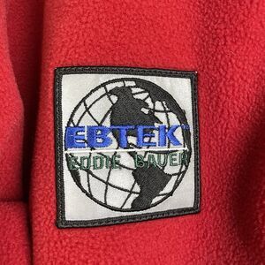 This listing is for an Eddie Bauer EBTEK Men's Fleece Jacket. Red/Black/Blue/White. Logo patch at the chest / 3 zip pockets / adjustable cinch cord at the interior waist and lower hem. Embroidered EBTEK logo down the sleeve. 100% Polyester/USA Made.