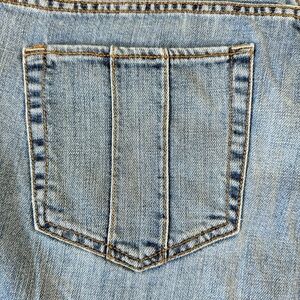 Eddie Bauer Embroidered Boyfriend Relaxed Fit medium whisker wash denim straight leg with slight taper jeans. Classic 5 pocket design. Tan embroidery on the front pockets, stitching down the back pockets. Medium-low rise.