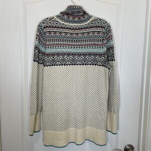 Ivory, blue, red and teal fair isle print pullover sweater by Eddie Bauer. Features a cowl neckline with a drawstring. Cotton, nylon and wool blend. Last pic shows the sweater in a different color scheme - shown for style/fit. Very good pre-owned condition. Bust across the front area measures approx. 19 inches.