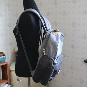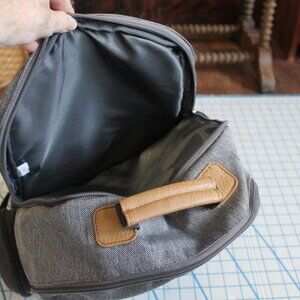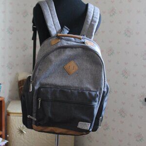 The Eddie Bauer Bridgeport Backpack diaper bag featuring the Places and Spaces organization system, allows for plenty of room for all of dad's, mom's and baby's needs with a spacious main compartment and 7 storage pockets. The main attraction are the 2 insulated side pockets, great for bottles and food. Carrying is a breeze with padded and adjustable shoulder straps and top handle. The fashionable Tone on Tone Gray Cross Hatch fabric with Tan Faux Leather Trim completes the stylish appeal of this ultra-functional bag.