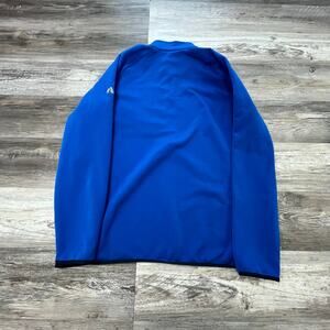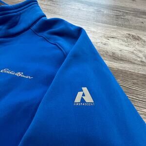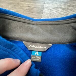 Eddie Bauer First Ascent Blue Mens 2XLT Half Zip Mock Neck Pullover Sweatshirt sweater jacket, in great condition, heavyweight polar fleece polyester/lycra fabric, raglan long sleeves, half sleeves, zipped chest pocket, pullover style, spell-out logo, outdoor casual performance plain blank, mens size 2XL Tall, 27" by 31.5"