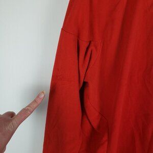 Pullover quarter zip long sleeve mock neck fleece. Zippered front chest pocket. Solid reddish orange.
