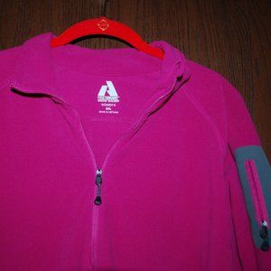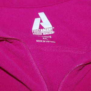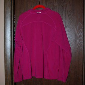 This fleece top is warm without being heavy. Color is a purplish pink (fuchsia perhaps?). Pullover style with zipper. Left sleeve also features a zip pocket. Quality top by Eddie Bauer. Machine wash and dry. Size XXL, but fits like XL.