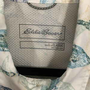 Eddie Bauer Fish Print Short Sleeve Button Up Shoulder Vented Shirt size L