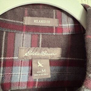 Stay warm and stylish with this Eddie Bauer Relaxed Fit Flannel Shirt. Made with soft brushed cotton, this shirt offers a cozy feel and a classic plaid design in shades of brown, red, and gray. Perfect for layering in cooler weather or wearing on its own for a timeless outdoorsy look.