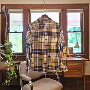Navy, cream/tan, and yellow flannel shirt from Eddie Bauer. Fabric is soft, definitely not a rugged flannel. Size is large, but fits pretty wide. Decently drape-y. Good candidate for a boyfriend flannel : )