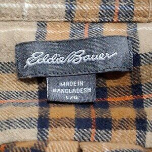 Eddie Bauer Flannel Mens Large Plaid Button Down Shirt 100% Cotton Tan