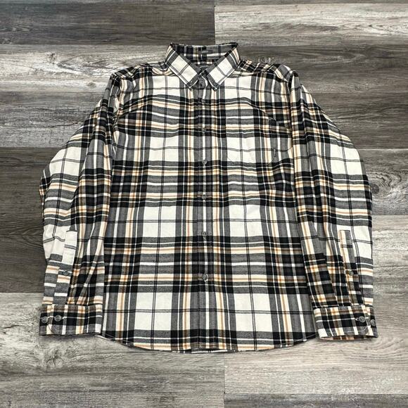 Eddie Bauer Flannel Shirt Black Tan Tartan Plaid Mens XL Classic Fit Button Up