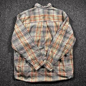 Condition: Good vintage condition with light wear and natural fading. Features a soft 100% cotton flannel fabric in gray, beige, and red plaid pattern. Single chest pocket and button cuffs. Classic Eddie Bauer outdoor style made in Malaysia.