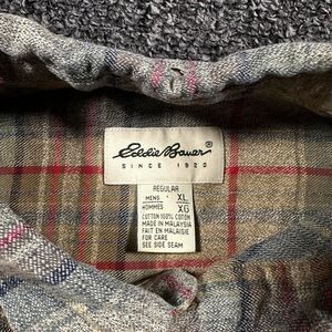 Keywords: Eddie Bauer flannel shirt, men’s XL plaid button-up, gray red beige cotton flannel, vintage outdoor shirt, rugged casual workwear