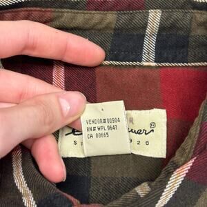 Vintage 90s y2k Eddie Bauer Flannel Tartan Plaid Red Green Mens L Tall Long Sleeve Button Shirt Button Up Shirt collared chest pockets buttoned cuff curved hem 100% cotton