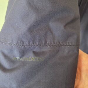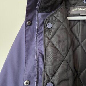 Waterproof/breathable cross-seasonal hooded trench coat is fully seam-sealed for maximum weather protection, Windproof with a lightweight ripstop polyester shell that causes moisture to bead off rather than soak in. Insulated liner buttons in to provide warmth when temperature demands it. Great travel coat! I used on a cruise to Iceland, and have removed lining to use as a raincoat only when temperatures are warmer. Zips and snaps on front placket to help with wind protection. Excellent Used Condition. Armpit to Armpit is 20.5". Overall length is 35" from center back neck. Dark violet with black lining.