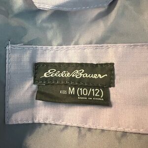 Eddie Bauer Water-resistant kids raincoat/windbreaker with hood. Features a stylish lavender and plum design. Ideal for rainy days.
