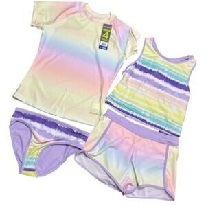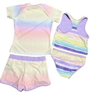 Each set includes (1) reversible tankini top, (1) reversible tankini bottom, (1) short sleeve rash guard, (1) swim short