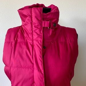 Eddie Bauer Goose Down Puffer Vest, Fuchsia, XS, Gently Used with No Flaws. This vest has a high fleece lined collar with a buckle for extra warmth and comfort. Zip and snap closure with zip front pockets. The waist has buckle clasps for tightening to a more fitted look. Shell and lining are 100% polyester. Insulated with Goose Down. Premium Quality Vest! Measures 18" across bust and 23 1/4" length.