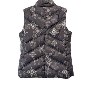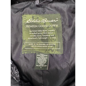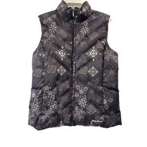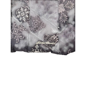 This is a pre-owned Eddie Bauer vest, size L. The outer shell is black with a gray floral pattern. It features a full zip closure and a stand-up collar. The vest is quilted and appears to be filled with down. There are two pockets on the front. The vest is in good condition with no visible stains or tears. The zipper functions smoothly.