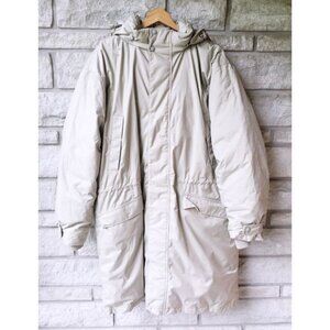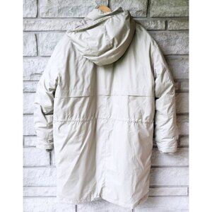 An Eddie Bauer goose-down parka coat. In excellent, like-new condition. Purchased about 20 years ago (it's nearly vintage!), and only worn a handful of times. It's original tag is no longer attached, but was still kept (in the pocket). Contains 4 front pockets on the outside, and 1 on the inside. Interior drawstrings are present for a tighter fit. Has a removable hood. Goose down filling. Color is a khaki tan. Please note that due to the overall bulk and thickness of the jacket, I do not believe I can give accurate measurements of it. Please reference the Eddie Bauer size chart on their website for fit. I will say however, that it is 42" in length.