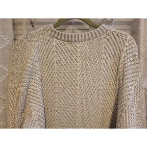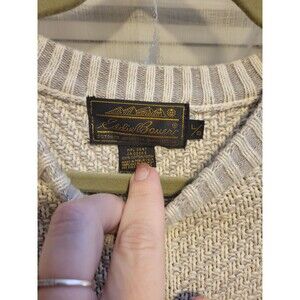 ******Please review pictures prior to purchase as there is a stain on left sleeve and stain on front********The Eddie Bauer Grandpa Sweater is a versatile and cozy addition to any man's winter wardrobe. Made from a sturdy cotton blend, this tight-knit sweater features a classic crew neckline and long sleeves, perfect for keeping warm during the colder months. The rustic beige color and solid pattern make it suitable for casual outings, workwear, or even a business setting. With a nod to Bill Cosby's iconic style and the rugged aesthetic of a fisherman, this sweater embodies a timeless American outdoor theme that is both practical and stylish.