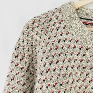 Cozy crewneck sweater by Eddie Bauer. Features a gray knit with red and navy accents.