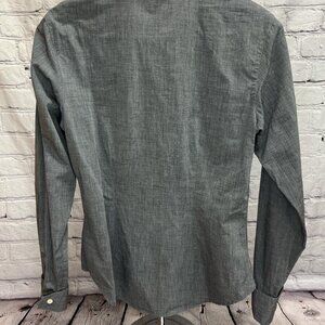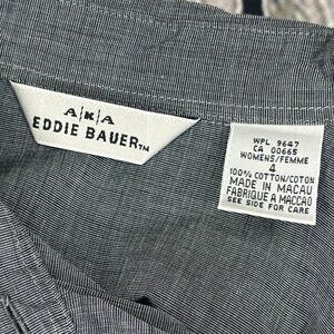 Preloved women's size 4 gray button-up shirt from Eddie Bauer. Made from 100% cotton, this versatile long-sleeve top is perfect for layering or wearing on its own for a comfortable, timeless look. Measurements: 17.5" pit to pit, 25" length, and 31.5" shoulder. Inv: 0146.