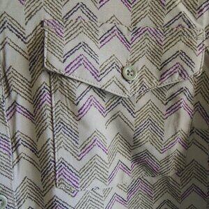 Eddie Bauer gray & purple chevron print outdoor dress, size Large. Light, breathable outdoor dress has a simple, shift-style design and gray background with purple and darker gray chevron print. Sleeveless (generous shoulder coverage), with a collar, buttons up the bodice, thin crochet belt loops, and two secure front pockets with button closure. Easily transitions from trail to town, great for travel. No belt. Otherwise EUC