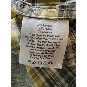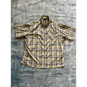 Gray, yellow, and white plaid button down shirt from Eddie Bauer. Breast pocket on upper left, short sleeves. Excellent condition.