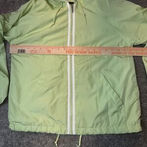 This Eddie Bauer windbreaker jacket is a versatile addition to any wardrobe. Its solid green color and classic design make it perfect for outdoor activities, travel, or casual wear. The jacket features a full zip closure with a drawstring, long sleeves, and a mid-length cut for added warmth.