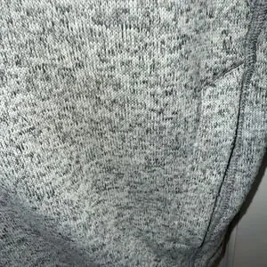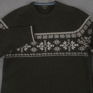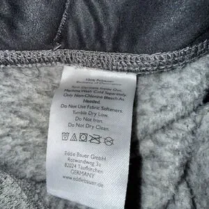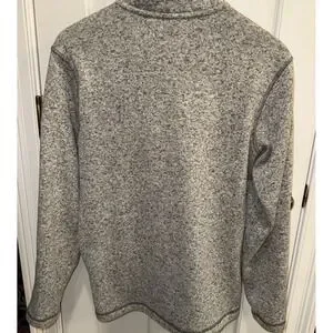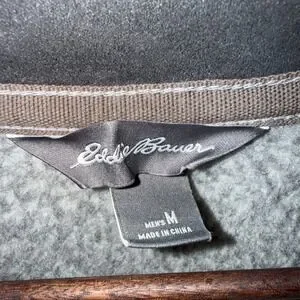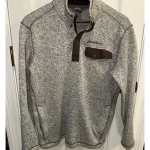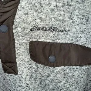 This Eddie Bauer Grey Brown Convector Snap Pullover is a stylish and versatile addition to any man's wardrobe. Made from polyester fleece fabric, it offers warmth during the colder seasons while still being comfortable to wear in casual or workwear settings. The solid gray color and tight-knit construction give it a classic and timeless look, while the long sleeves and pullover style make it easy to throw on for any occasion. With accents like the Eddie Bauer logo and convenient features like pockets and easy care instructions, this sweater is perfect for men on the go in winter, fall, or spring. Smoke free home. Chest measurement across 22". Length 27". Pockets.
