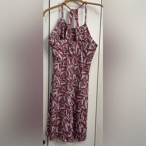 Elegant dress with a leaf design. Features burgundy and white colors. Ideal for versatile wear. Worn, great condition. Chest - 17 1/2” Length - 32 1/2”