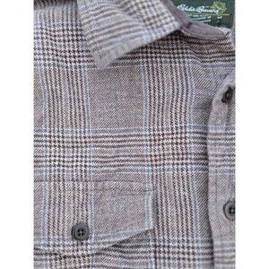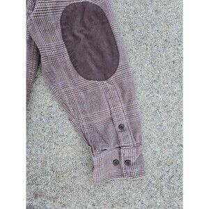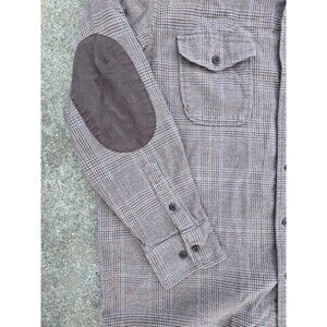 Very good condition, plaid flannel. Brown with stripes of blue. Elbow patches. Heavy weight cotton (91%) wool blend (9%). Top of shoulder to end of sleeve cuff 24 in, top of shoulder to bottom of shirt hem 27 in, across chest pit to pit 22 inches. I'll measurements give or take an inch and a half.