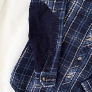 Keywords: Eddie Bauer women’s shacket, plaid flannel corduroy trim, navy blue snap button shirt jacket, outdoor casual layering piece, EUC, granola girl, outdoorsy, chore jacket