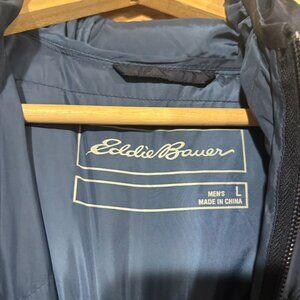 Eddie Bauer Jacket Large Blue Navy Full Zip Goose Down Puffer 650 Fill Hooded