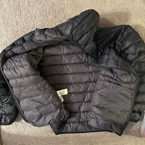 The jacket is a size L and has a full zip closure. It is filled with down insulation material for warmth and comfort, and also has the Eddie Bauer logo on it as an accent. This jacket is perfect for travel, casual wear, and workwear. Don't miss out on the chance to own this high-quality jacket from a trusted brand.