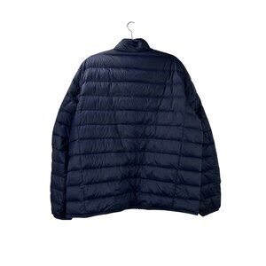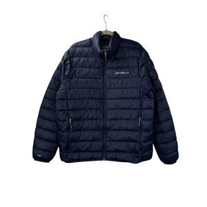 The Eddie Bauer Jacket for men in XL size is a navy blue puffer down coat, perfect for outdoor activities in the winter, fall, and spring seasons. The jacket features a solid black color with the Eddie Bauer logo accent, making it a stylish and practical choice for casual occasions. Made with a durable nylon outer shell and insulated with warm down, this puffer jacket offers comfort and protection against the cold weather. Additionally, it includes convenient pockets for added functionality.