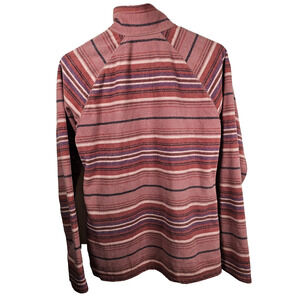 This Eddie Bauer women's small pink striped fleece pullover sweatshirt is perfect for travel, casual wear, or even workwear. The long sleeves and 1/2 zip closure make it easy to layer during the winter, fall, or spring seasons. The lightweight fleece lining provides comfort, while the polyester fabric is machine washable for convenience. With a regular fit and western, outdoor, or Southwestern theme, this sweatshirt is a stylish and versatile addition to any wardrobe.