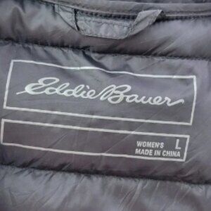 Eddie Bauer Jacket Womens L EB650 Down Puffer Outdoors Black Packable READ!. Pre-owned in good condition with some flaws. A small white stain, a small tear infront that has been stitched, another 2 small holes at the back all on the left arm as shown in the last pictures. Overall good condition. Please review photos for details and let me know if you have any questions.