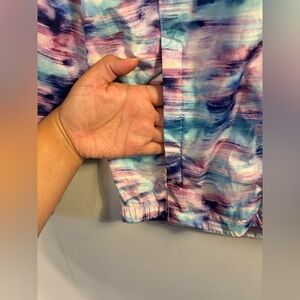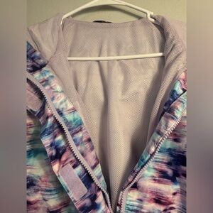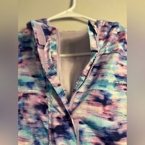 Vibrant raincoat with a mix of colors. Water-resistant and perfect for wet weather.