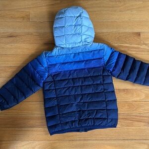 Stylish puffer jacket by Eddie Bauer. Features a gradient of blue shades. Warm and cozy for kids.