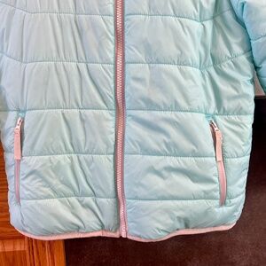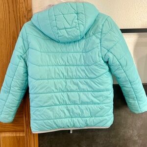 This adorable and ultra-warm Eddie Bauer kids’ jacket is two coats in one! It’s fully reversible with a sleek, aqua quilted puffer exterior and a plush gray tie-dye faux fur interior. Designed for cozy warmth. Durable, stylish, and machine washable.