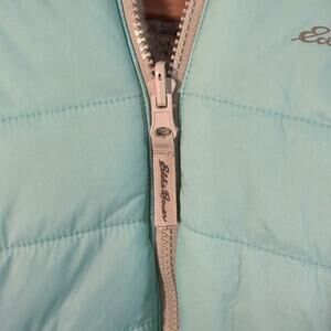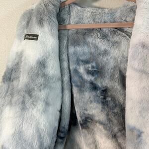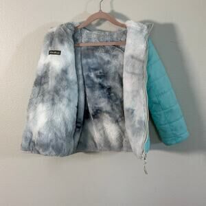 This adorable and ultra-warm Eddie Bauer kids’ jacket is two coats in one! It’s fully reversible with a sleek, aqua quilted puffer exterior and a plush gray tie-dye faux fur interior. Designed for cozy warmth, it's perfect for chilly school mornings, snow days, or winter outings. Durable, stylish, and machine washable.