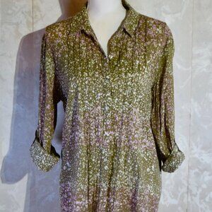 This beautiful Eddie Bauer blouse in size L is perfect for a casual or business-casual look. It features a unique green and purple speckled, or ditsy floral, pattern with vertical pintuck pleating on the front. The sleeves have roll-tab buttons, allowing them to be worn long or as a 3/4 length sleeve. The fabric content is likely a comfortable, wrinkle-resistant blend.