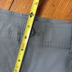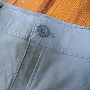 The Eddie Bauer Ladies Cargo Pocket Short in Cinder Gray, size 12, is a versatile and stylish pair of shorts perfect for travel, hiking, and casual wear. Made from a blend of nylon and spandex, these shorts offer lightweight comfort and stretch for ease of movement. The high-rise design and flat front give a flattering silhouette, while the cargo pockets provide convenient storage for essentials during outdoor activities. With a solid gray color and subtle button and zipper accents, these shorts are a practical and fashionable addition to any woman's wardrobe for the summer, fall, or spring seasons.