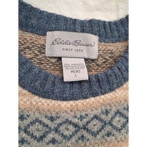 Eddie Bauer Lambs Wool Sweater Fair Aisle Blue Tan Geometric Nordic Crew Neck L