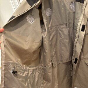 This is an Eddie Bauer Large (L) green and black heavy duty rain jacket. Please note this is missing the zipper, but has velcro up and down and snap buttons at the top and bottom, along with an elastic drawstring in the middle and at the bottom.