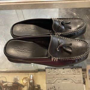 Eddie Bauer AMAZONAS Style Leather mule shoes women’s size 6M Navy Blue Great preowned shape . Toss off front white stitching traction souls.