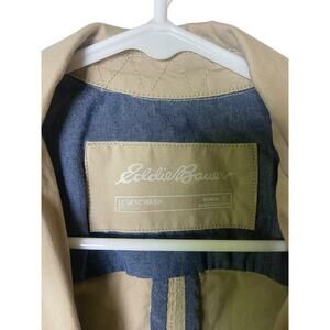 Classic tan field coat from Eddie Bauer, crafted with Legendwash stretch fabric for durability and comfort, tailored blazer-style design for a polished yet casual look, multiple functional pockets for convenience, size 8 fits comfortably, perfect for layering over sweaters or shirts, versatile for casual, outdoor, or travel wear