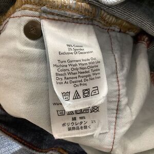 Vintage Y2K Stylish boot cut jeans. Light blue denim. Embroidered floral detail on leg. Classic five-pocket design.