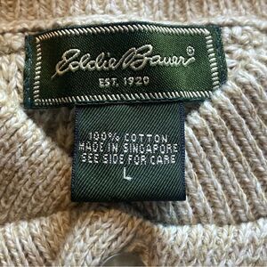 Eddie Bauer Light Brown/Cream Knit Henley Style Sweater Size Large. Excellent pre-owned condition. 5 button front. 100% cotton. Measures approximately chest 48", length 29", sleeve 26.5".